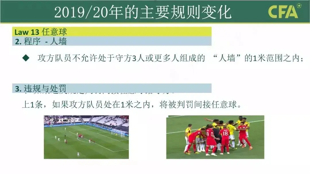 首先需要科普一下现行人墙规则:当防守方组成3人及以上的人墙人数时,为避免冲突,攻防球员必须距离人墙1米以上,直至比赛恢复,如果违反将判给防守方间接任意球。需要注意的是,“直至比赛恢复”指的是任意球踢出时。