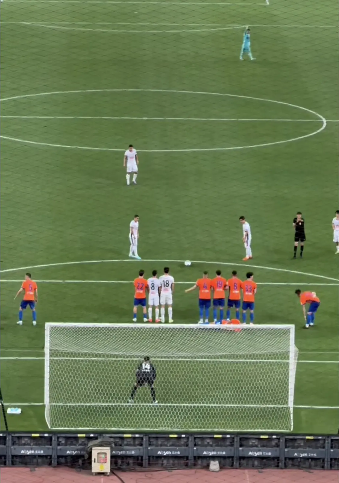再看一下转播画面的正面视角,两队球员可以说在一条线上,因此在球开出之前攻防球员与人墙的距离并不符合1米的要求。因此,按照规则,成都蓉城的这个进球应该判无效,并且判给泰山队一个间接任意球,而主裁判麦麦提江判罚进球有效无疑是一次重大的误判。